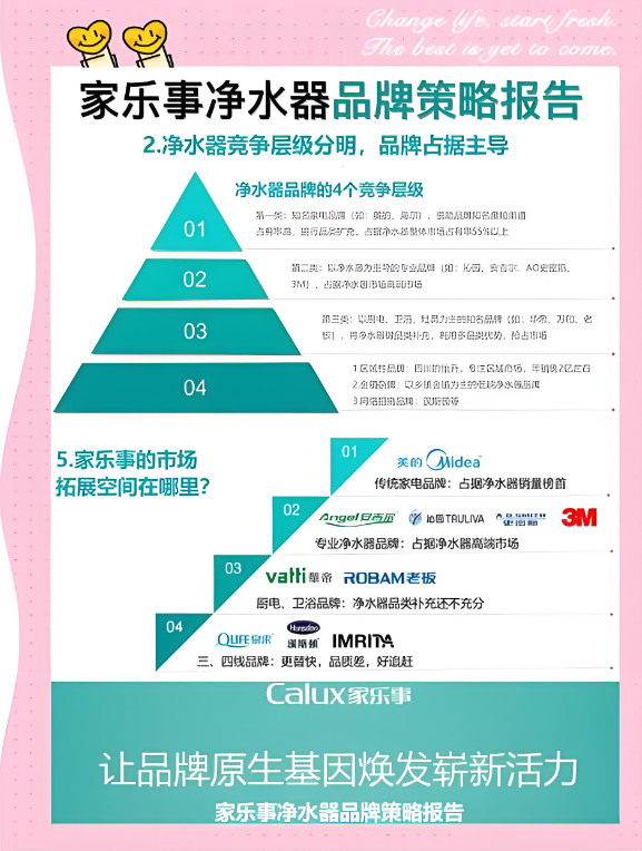 从使用需求的角度来讲,现在很多净水器品牌基本上都拼大流量、低价格,实际上小流量的净水器加个压力桶的净水器使用成本却要低很多,而家乐事的净水器品类齐全,对于同一类型的净水器基本上有1-2款的姊妹款可以选择,其他品牌净水器一根500G以上的RO膜滤芯随随便便就好几百,一套下来没个一千RMB是搞不定的,所以很多用户在现今的环境下都是买得起,后续却用不起,家乐事净水器能在更低的后续使用成本上让客户得到更美的使用体验。